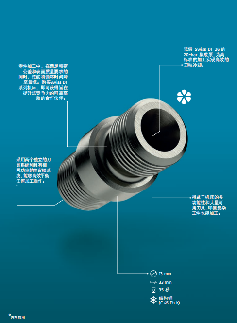 Swiss DT 系列瑞士型車床專業設計滿足典型長 短車削工件的各種要求。該系列機床簡單易 用,加工直徑達 13 和 25.4 mm,可顯著提高生 產效率。Swiss DT 系列采用先進的技術和高效的五軸運動結構,是所有車削和銑削加工的理想之選。