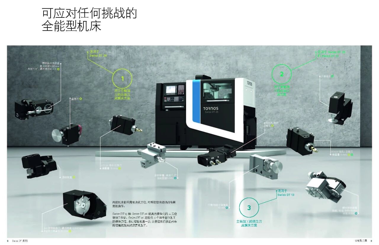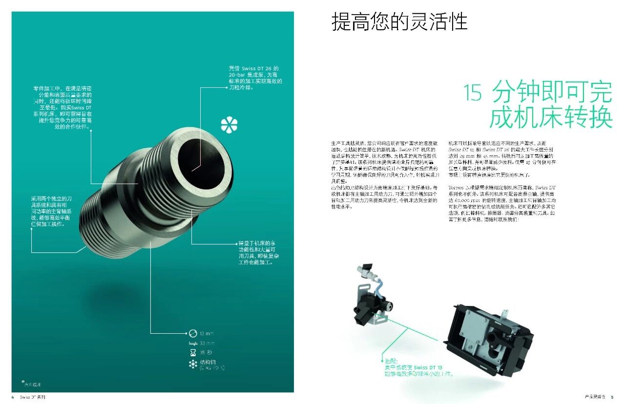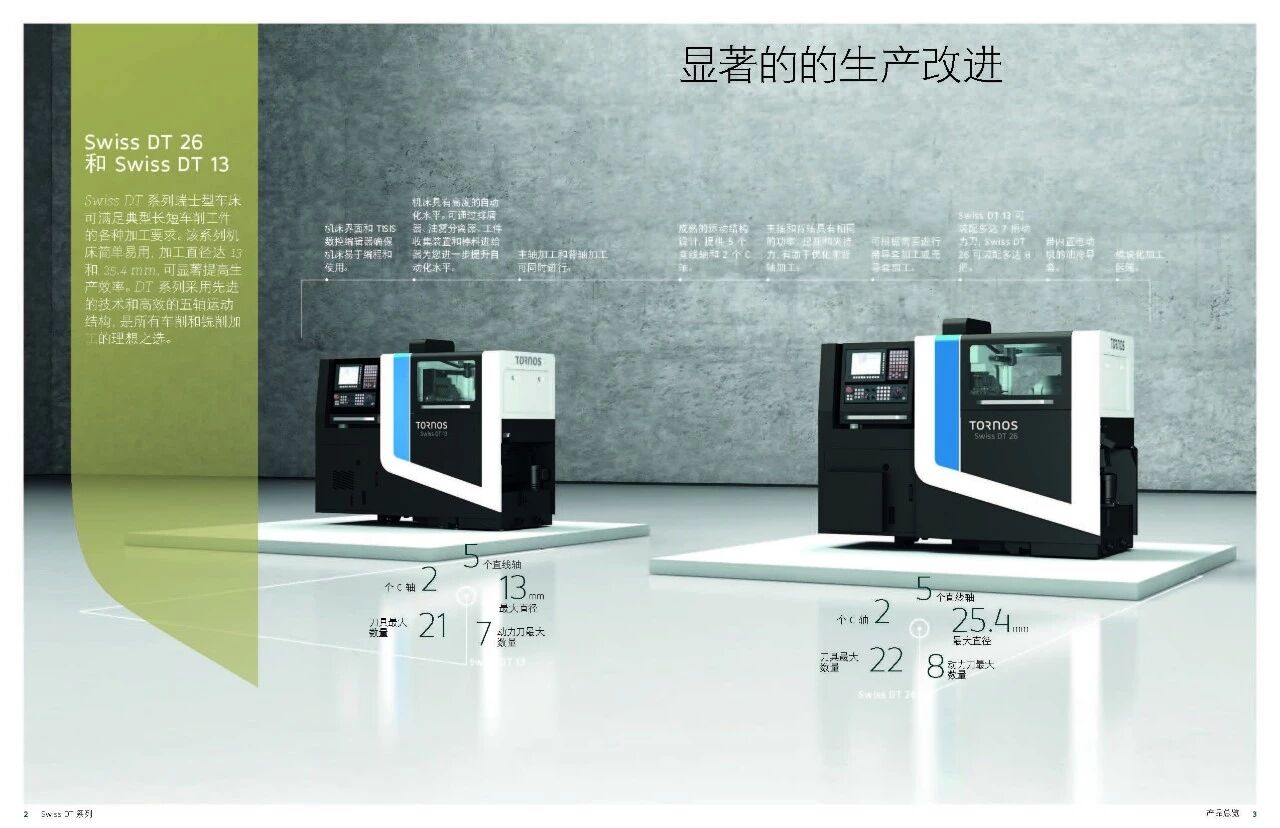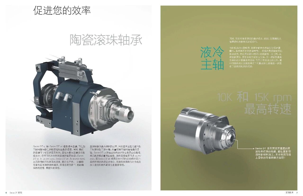 Swiss DT 系列瑞士型車床專業設計滿足典型長 短車削工件的各種要求。該系列機床簡單易 用,加工直徑達 13 和 25.4 mm,可顯著提高生 產效率。Swiss DT 系列采用先進的技術和高效的五軸運動結構,是所有車削和銑削加工的理想之選。